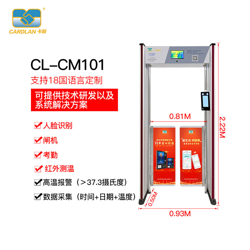 卡聯(lián)人臉識別測溫安檢門是一種精確、便利的測試人體體溫的檢測設備。當人從安檢通道走過時,如果人的身體溫度超過事先設定的溫度, 系統(tǒng)就會自動報警。如果體溫正常,則顯示正常體溫值,并將體溫實時顯示在屏幕上。本產(chǎn)品使用方便、簡單,可以被安裝在學校、幼兒園、車站機場、地鐵出入口、商場超市、工礦企業(yè),各類展會等人流量大的公共場所。而且移動方便靈活,精確度高,可以測量顯示 30℃-50℃, 使得它不僅對感染病毒導致體溫升高人士作出檢測報警,同時也被用來作為快速的體溫測量設備。