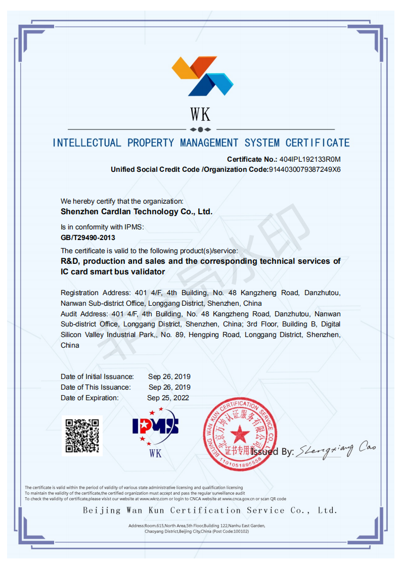 通過制度建設(shè)、全員參與、穩(wěn)健推進(jìn)、逐步落實(shí),2019年9月26日,深圳市卡聯(lián)科技股份有限公司正式通過北京萬坤認(rèn)證服務(wù)有限公司的外審認(rèn)證,獲得知識(shí)產(chǎn)權(quán)管理體系認(rèn)證證書。該認(rèn)證的通過,彰顯了深圳市卡聯(lián)科技股份有限公司對(duì)于知識(shí)產(chǎn)權(quán)重視和全面升級(jí),標(biāo)志著企業(yè)知識(shí)產(chǎn)權(quán)管理進(jìn)入全新階段。