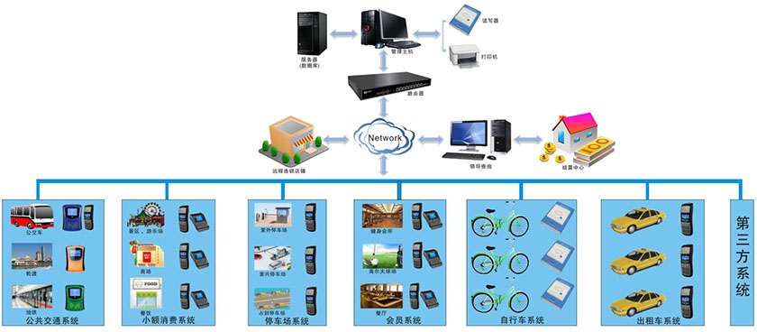 用戶持卡到消費網(wǎng)點進行消費,購買相應(yīng)的產(chǎn)品或服務(wù)。消費網(wǎng)點完成相應(yīng)的消費功能,記錄用戶的消費交易明細,通過采集設(shè)備上傳到數(shù)據(jù)中心進行處理。消費網(wǎng)點通過內(nèi)部的安全模塊,保證交易的安全可靠。 在城市一卡通系統(tǒng)中,IC卡的聯(lián)機交易系統(tǒng)和帳務(wù)系統(tǒng)可以與銀行合作組建,其它系統(tǒng)需要由市政府的公用事業(yè)局或相關(guān)運營單位共同完成。