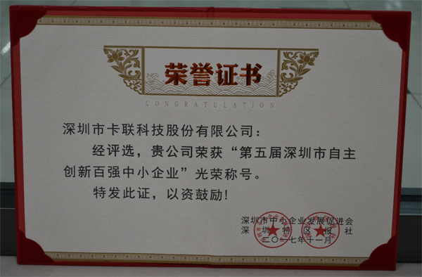 深圳第五屆自主創(chuàng)新百強(qiáng)中小企業(yè)暨十佳中小企業(yè)創(chuàng)業(yè)英才,在五洲賓館“新鮮出爐”了!卡聯(lián)股份被評(píng)為第五屆深圳市自主創(chuàng)新百強(qiáng)中小企業(yè),這些企業(yè)是從數(shù)千家報(bào)名企業(yè)中經(jīng)過嚴(yán)格程序評(píng)選出來的,可謂是深圳160多萬家中小企業(yè)的優(yōu)秀代表。出席頒獎(jiǎng)儀式的中國中小企業(yè)協(xié)會(huì)會(huì)長李子彬?qū)ι钲谥行∑髽I(yè)給予高度評(píng)價(jià)。他說:“深圳是我國首個(gè)國家創(chuàng)新創(chuàng)新型城市,能夠得到如此高的榮譽(yù),深圳的中小企業(yè)功不可沒。中小企業(yè)自主創(chuàng)新精神強(qiáng),自主知識(shí)產(chǎn)權(quán)多,代表了我國中小企業(yè)的最高水平。”