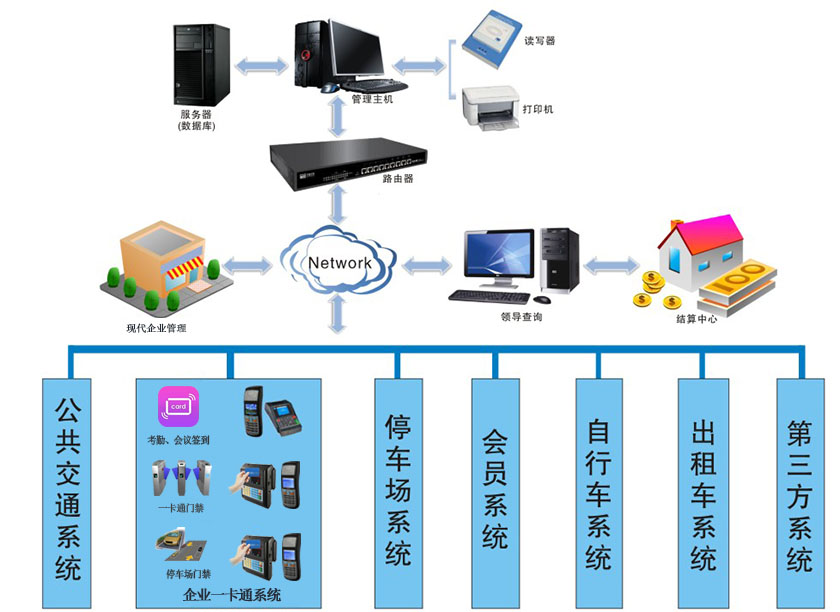 卡聯(lián)科技企業(yè)一卡通系統(tǒng)由“考勤管理系統(tǒng)、出入管理系統(tǒng)、收費管理系統(tǒng)”等組成,以非接觸IC卡為依托,針對現(xiàn)代化企業(yè)的需求,將管理和服務(wù)設(shè)施全面納入計算機綜合管理系統(tǒng)。企業(yè)員工使用一張經(jīng)過授權(quán)的IC卡,便可以通過一卡通系統(tǒng)的軟件功能和硬件配套設(shè)備實現(xiàn)消費、門禁、考勤、身份識別、用水、用電、車輛出入管理等“一卡通”服務(wù);并可以拓展到巡更、電梯控制、會議簽到、醫(yī)療、圖書借閱、班車等系統(tǒng);更可以與企業(yè)HR系統(tǒng)、OA系統(tǒng)、ERP系統(tǒng)、財務(wù)等系統(tǒng)對接,交互及共享數(shù)據(jù)信息,為企業(yè)管理者提供各類綜合查詢、綜合分析的基礎(chǔ)數(shù)據(jù)。
