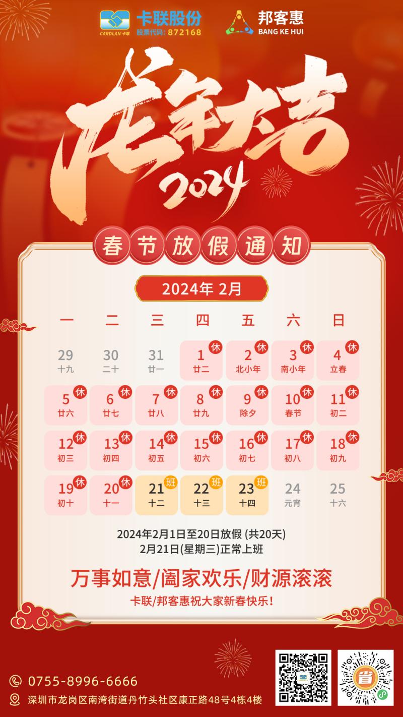 關(guān)于卡聯(lián)股份2024年春節(jié)放假通知
